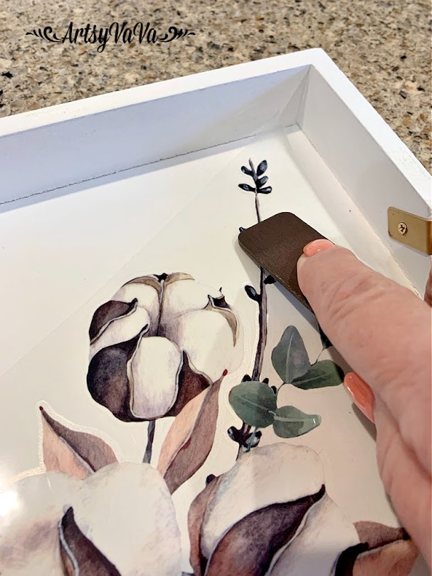 I placed the design with the clear overlay where I wanted it on the tray & rubbed over it with the applicator stick provided in the package.